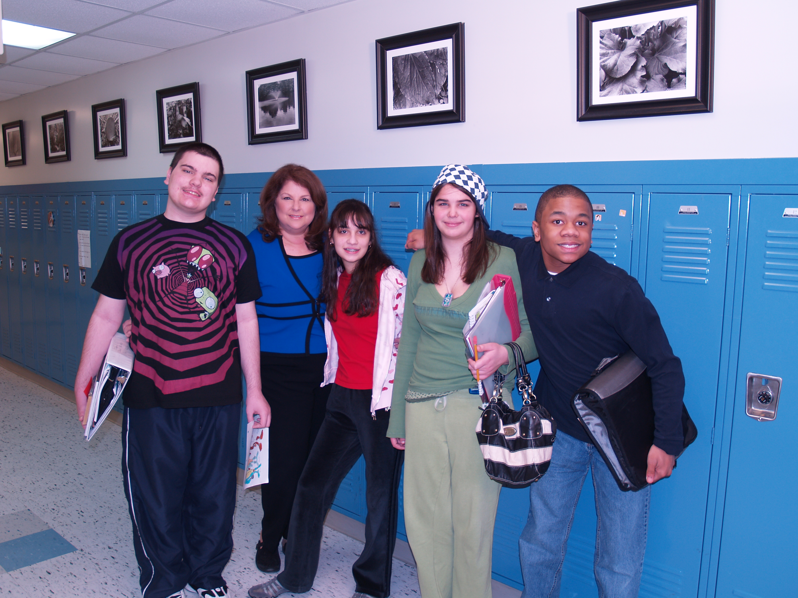 Sara Lee Kessler, (Reporter) with teens at The Children’s Institute, a school in Verona, NJ, for children on the autism spectrum. From the left: James S., Natalie C., Emily V., Philip C. |
